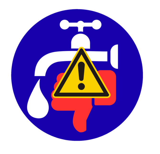 Znak z wykrzyknikiem, kran z kroplą wody i ręka z kciukiem w dół na niebieskim tle