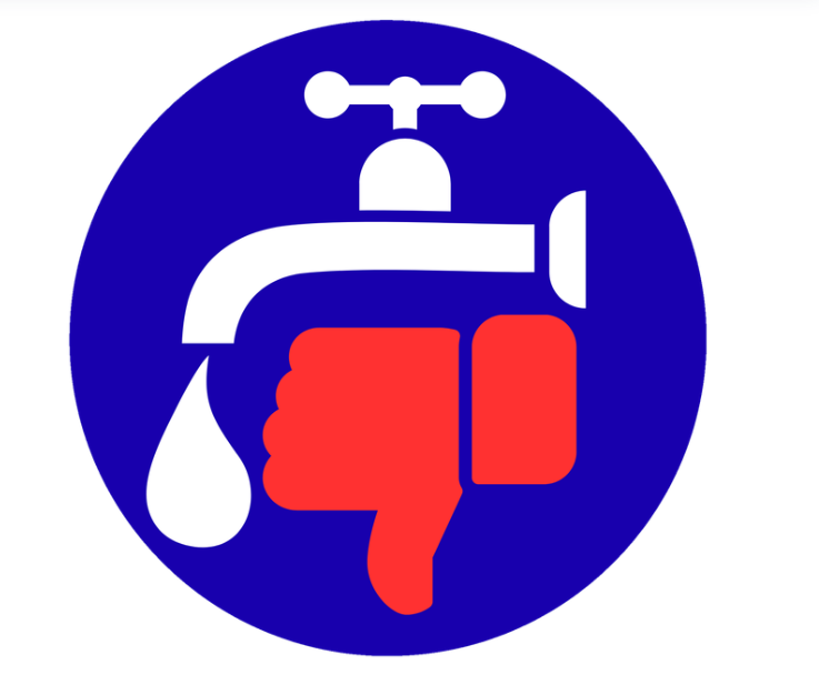 Kran z kroplą wody i ręka z kciukiem w dół na niebieskim tle