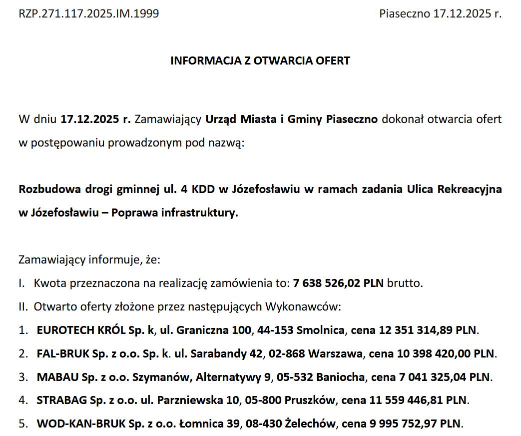 Otwarcie ofert: ul. Rekreacyjna