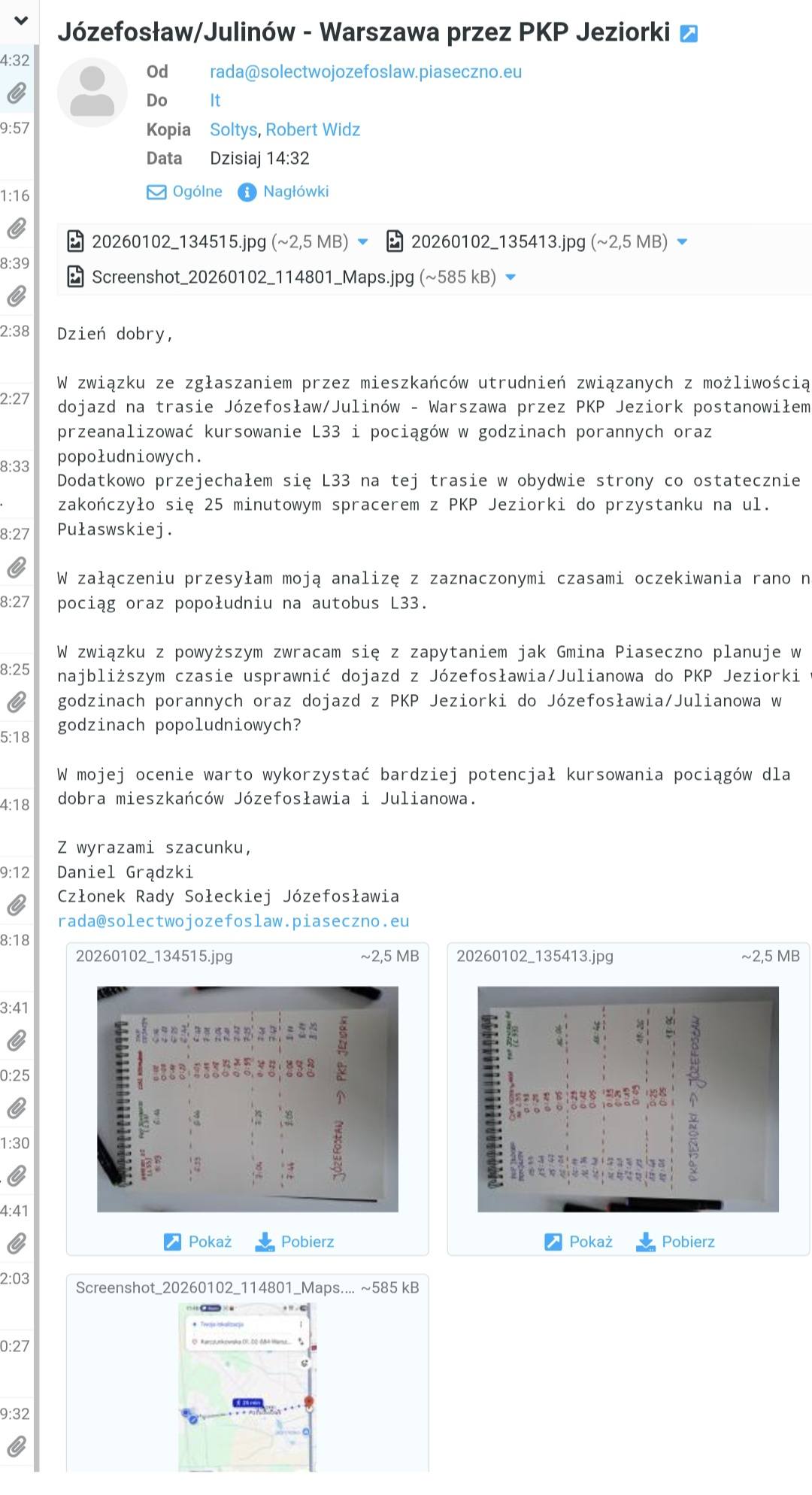 Postanowiłem przeanalizować kursowanie L33 oraz pociągów rano oraz popołudniu rezultetem czego było wysłanie do Gminy jak w najbliższym czasie planuje usprawnić połączenie Józefosław/Julinów – Warszawa przez PKP Jeziorki.